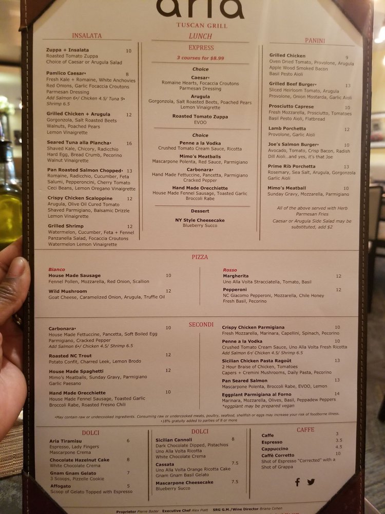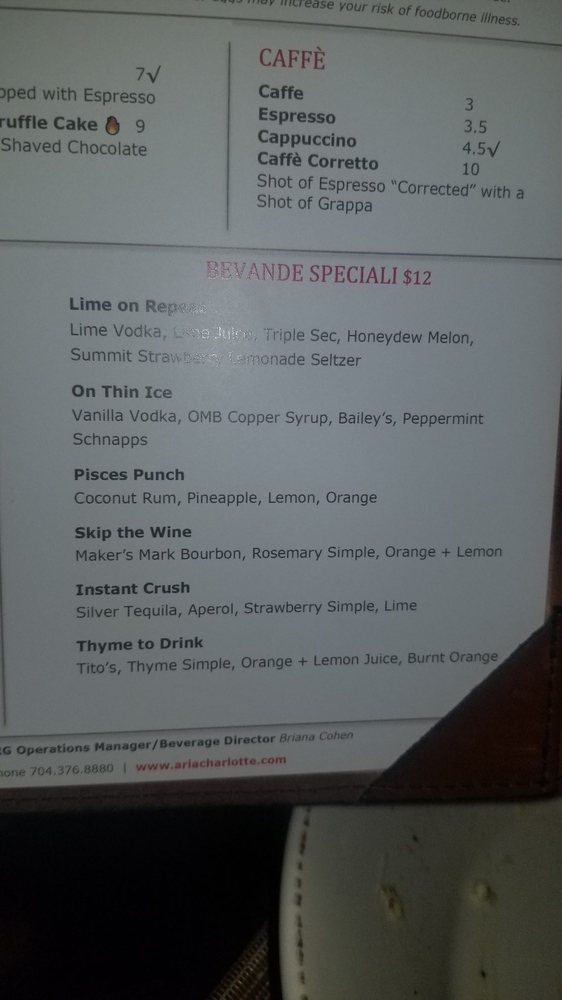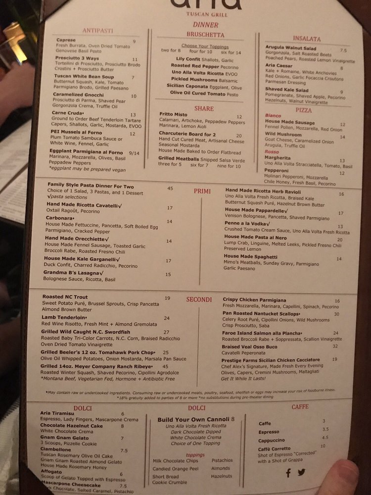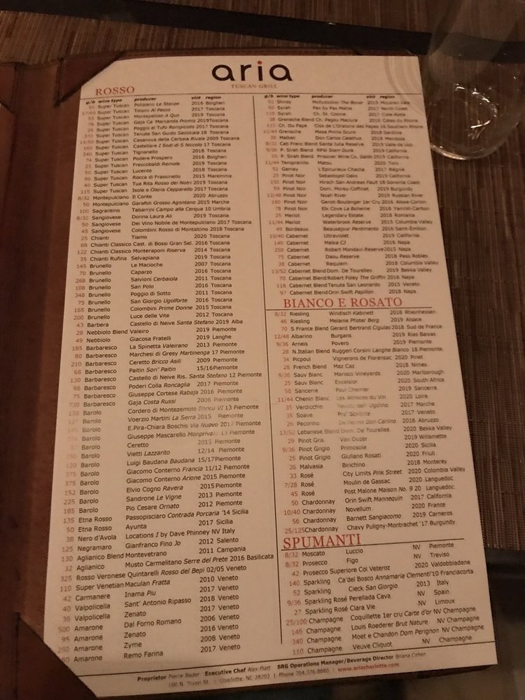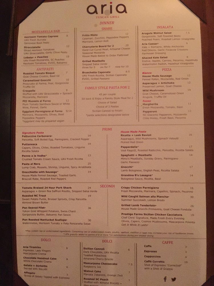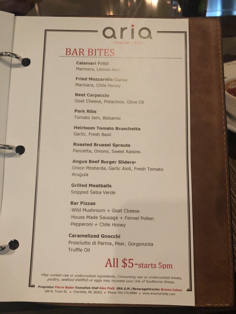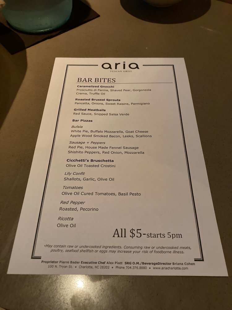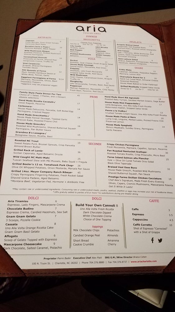 Aria is a sophisticated restaurant located in Charlotte, NC, offering a fusion of New American, Unclaimed, and Italian cuisine. With a classy ambiance and excellent service, Aria provides a diverse menu that caters to various dietary preferences, including vegan and vegetarian options. From Tomato Braised Meatballs to Grilled Meatballs, the Antipasti/Insalata selection showcases flavorful dishes for starters. For the main course, options like Fritto Misto Dinner and Charcuterie Board for 2 deliver a satisfying dining experience. Customers rave about the quality of dishes such as lamb shanks, corn ravioli with lobster, and grilled paesano Bruschetta. Aria's dedication to consistency, creativity, and service excellence makes it a top choice for a memorable dining experience.